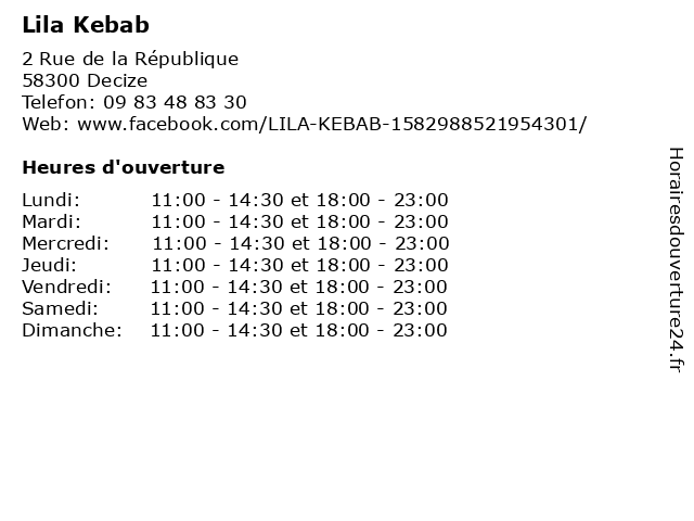 | Mercredi | 11:00-14:30 et 18:00-23:00 |