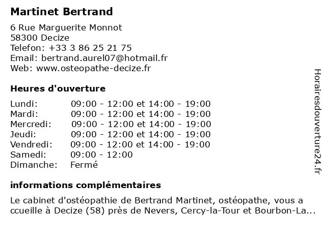 2 Dr Patrick Bertrand - Chirurgien vasculaire (Distance: 30,95 km) 1 Avenue Patrick Guillot, 58000 Nevers bertrand, chirurgie, chirurgien, consultation, docteur, dr, et, médecins, patrick, rendez, santé, sur, thoracique, vasculaire, vous 3 Martinet Pianos (Distance: 31,86 km) 52 Avenue Louis Fouchere, 58640 Varennes vauzelles martinet, pianos 4 Mathilde Martinet - Psychomotricienne (Distance: 37,62 km) 6-15-24-36 rue Simone Veil, 58600 Garchizy consultation, docteur, martinet, mathilde, med, médecin, médecine, psychomotricienne, traitement 5 Dr Bertrand Dumoulin - Psychiatre (Distance: 51,10 km) 51 rue des Hotelleries, 58400 La Charite-sur-Loire bertrand, consultation, docteur, dr, dumoulin, med, medecine, medical, médecin, psychiatre, traitement |