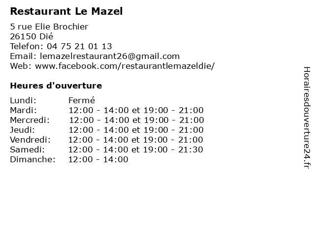 | Samedi | 12:00-14:00 et 19:00-21:30 |