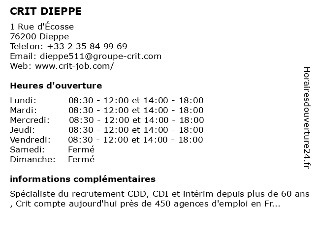 1 CRIT NEUVILLE-LES-DIEPPE (Distance: 1,98 km) 25 Avenue de la Libération, 76370 Dieppe crit, dieppe, les, neuville 2 Crit Sainte Marie des Champs (Distance: 40,15 km) 25 Avenue René Coty, 76190 Sainte-Marie-des-Champs champs, crit, des, marie, sainte 5 CRIT ROUEN Industrie Transport / Log (Distance: 54,07 km) 17 Quai Pierre Corneille, 76000 Rouen crit, industrie, log, rouen, transport 6 Crit Job (Distance: 54,42 km) 119 cours Clemenceau, 76100 Rouen agence, crit, emplois, intérim, job, offres |