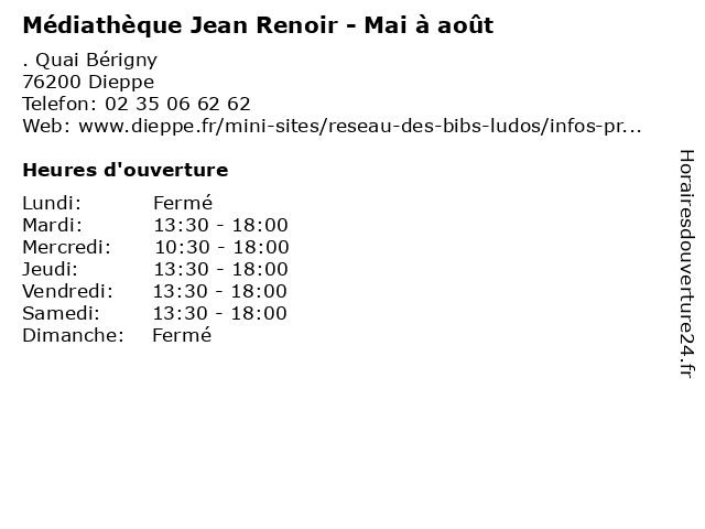 1 Médiathèque Jean Renoir - Septembre à avril (Distance: 0,00 km) . Quai Bérigny, 76200 Dieppe avril, cd audio, cd.rom, horaires, jean, livres, médiathèque, renoir, revues, septembre 2 Soleil Tropical - Août à Février (Distance: 0,40 km) 3 Rue Guillaume Terrien, 76200 Dieppe août, d'août, d'oaût, février, horaires, institut de bronzage, manucure, soleil, tropical 3 Musée de Dieppe - Du 1er octobre au 31 mai (Distance: 0,71 km) - rue de Chastes, 76200 Dieppe 1er, 31, au, de, dieppe, du, exposition, mai, musée, octobre, visite 4 Bibliothèque Jacques-Prévert - Juillet à août (Distance: 1,02 km) . Rue Montigny, 76200 Dieppe août, bibliothèque, cd audio, cd.rom, jacques, juillet, livres, prévert, revues 5 Bibliothèque-ludothèque le Drakkar - Juillet à août (Distance: 1,45 km) . Rue Jean-Pierre Leguyon, 76200 Dieppe août, bibliothèque, cd audio, cd.rom, drakkar, juillet, le, livres, ludothèque, revues 6 Rêve De Bisons - fevrier à mai et septembre à décembre (Distance: 18,52 km) 24 Route De Dieppe, 76590 Muchedent bisons, boissons, de, décembre, et, fevrier, mai, restaurants, reve, rêve, septembre |