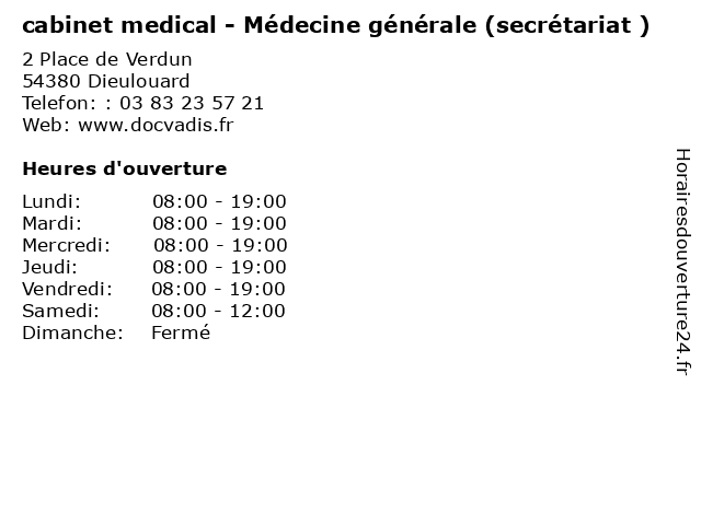 1 cabinet medical - Médecine générale (secrétariat ) (Distance: 15,85 km) 16 rue des Eglantiers, 57420 Louvigny cabinet, consultation, docteur, générale, medical, médecine, santé, secrétariat 2 Cabinet Médical - Médecine générale (secrétariat ) (Distance: 6,04 km) 90 D Rue Jean Jaurès, 54820 Marbache cabinet, consultation, docteur, générale, médecine, médical, santé, secrétariat 3 Dr. Gilles Janezic - Médecine générale (Consultation sur rendez-vous) (Distance: 6,06 km) 22 Avenue Camille Cavallier, 54700 Pont A Mousson consultation, docteur, dr., gilles, générale, janezic, médecine, rendez, santé, sur, vous 4 Dr. Gilles Janezic - Médecine généraleConsultation libre (Distance: 6,06 km) 22 Avenue Camille Cavallier, 54700 Pont A Mousson consultation, docteur, dr., gilles, généraleconsultation, janezic, libre, médecine, santé 5 maison médicale - Médecine générale (secrétariat ) (Distance: 7,01 km) 35C impasse de la brasserie, 54700 Pont-à-Mousson consultation, docteur, générale, maison, médecine, médicale, santé, secrétariat 6 Cabinet Infirmier Mathieu Audrey et Moreau Isaure (Distance: 7,32 km) 18 Rue du Buzion, 54610 Belleau audrey, cabinet, et, infirmier, isaure, mathieu, moreau |