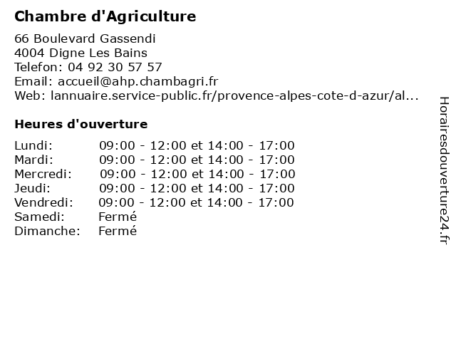 1 Chambre de l'agriculture (Distance: 0,02 km) 66 Boulevard Gassendi, 04995 Digne-les-Bains administration, chambre, communes, de, l'agriculture, service, services publics 2 Chambre de Commerce et d'Industrie (Distance: 0,04 km) 60 Boulevard Gassendi, 04000 Digne-les-Bains chambre, commerce, d'industrie, de, et 3 Chambre de métiers et de l'artisanat (CMA) (Distance: 0,44 km) 23 Allée des Fontainiers, 04000 Digne-les-Bains administration, assoc, chambre, cma, de, et, l'artisanat, métiers, services, services publics 4 Gîte des Trois Vallées (Distance: 3,06 km) . Route Barles, 04000 Digne Les Bains annuaire gîte, chambre, des, gîte, services, trois, vallées 5 Aubert (Distance: 3,99 km) 9 Rue Nicéphore Niepce, 04000 Digne Les Bains accesories, aubert, bebe, chambre, deco, mode 6 Chambre d'Hôtes L'Odalyre (Distance: 28,17 km) . Chemin de Quinson, 04360 Moustiers-Sainte-Marie bar, chambre, d'hôtes, hotel, l'odalyre, restaurant, service |