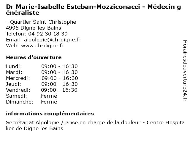 Termes de recherche pour Dr Marie-Isabelle Esteban-Mozziconacci - Médecin généraliste:les, de, bains, marie, centre, soins, isabelle, digne, généraliste, hospitalier, docteur, médecin, dr, mozziconacci, algologie, algologue, esteban |