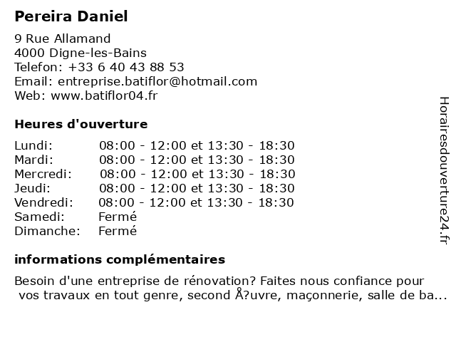 | Lundi | 08:00-12:00 et 13:30-18:30 |