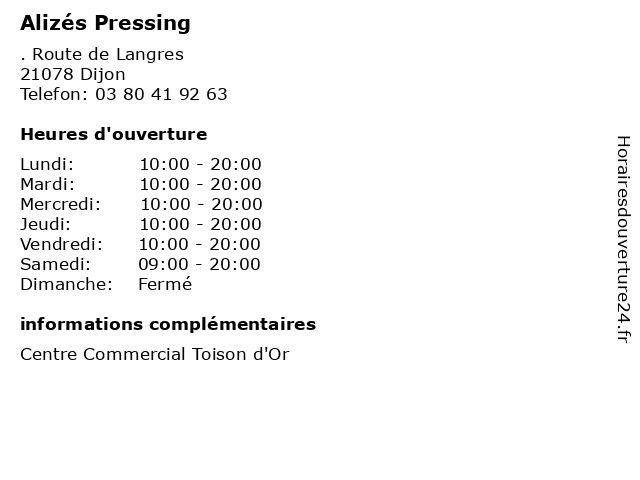1 Alizés Service (Distance: 0,02 km) s/n Route de Langres, 21000 Dijon alizés, matière, nettoyages à sec, service, textile 2 Pressing (Distance: 1,42 km) . Pré Potets, 21121 Fontaine- Les-Dijon cafe, enfants.chaussures, lingerie, mode hemmes, mode homme, pressing, restaurant 3 Pressing de Fontaine (Distance: 3,96 km) 61 Rue de Dijon, 21121 Fontaine-lès-Dijon de, fontaine, pressing 5 Pressing Véro Multiservices (Distance: 5,81 km) 36 Rue d'Auxonne, 21000 Dijon lavage, laver, laverie, multiservices, pressing, véro, écologiques 6 Top Pressing (Distance: 9,05 km) . Rue de Longvic, 21300 Chenove beaute, cafe, chaussures, enfants, lingerie, mode femmes, mode hommes, pressing, restaurant, royaume, sport, top |