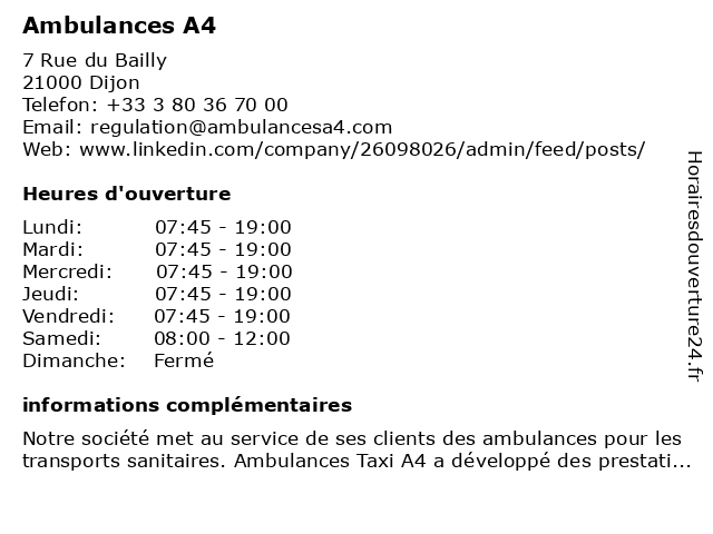 1 AMBULANCES DU LAC (Distance: 5,82 km) 11 Rue Jean-Baptiste Say, 21800 Chevigny-Saint-Sauveur ambulances, du, lac 2 Harmonie Ambulance (Distance: 4,53 km) 2 rue des Peupliers, 21800 Quétigny agence, ambulance, ambulances, harmonie, médical, services, transports 3 Allo Auxonne Ambulances A4 (Distance: 29,56 km) 51 Place de Verdun, 21130 Auxonne a4, allo, ambulances, auxonne 4 AMBULANCES VANNET DELACROIX (Distance: 40,79 km) Rue Berthelot, 70100 Gray ambulances, delacroix, vannet 5 Ambulances Auvert-Perrot (Distance: 50,55 km) 36 Avenue de Dijon, 21150 Venarey-les-Laumes ambulances, auvert, perrot 6 Ambulances Bourguignonne Chagny (Distance: 54,68 km) 16 Rue du Pâquier Fane, 71150 Chagny ambulances, bourguignonne, chagny |