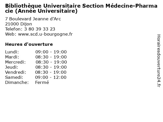 1 Bibliothèque Universitaire Section Médecine-Pharmacie (congés d'hiver et de printemps) (Distance: 0,00 km) 7 Boulevard Jeanne d'Arc, 21000 Dijon bibliothèque, congés, d'hiver, de, et, livre, médecine, médiathèque, pharmacie, printemps, section, services, universitaire 2 Bibliothèque Universitaire Section Médecine-Pharmacie (congés d'été) (Distance: 0,00 km) 7 Boulevard Jeanne d'Arc, 21000 Dijon bibliothèque, congés, d'été, livre, médecine, médiathèque, pharmacie, section, services, universitaire 3 Médecine du Travail - Médecine générale (secrétariat) (Distance: 0,34 km) 4 Boulevard Maréchal de Lattre de Tassigny, 21000 Dijon consultation, docteur, du, générale, médecine, santé, secrétariat, travail 4 Bibliothèque Universitaire Sciences-Économie (Année Universitaire) (Distance: 0,35 km) 6 Rue Sully, 21000 Dijon année, bibliothèque, livre, médiathèque, sciences, services, universitaire, économie 5 CHU Nantes - Médecine légale : Unité médico-judiciaire (Distance: 0,54 km) 14 Rue Paul Gaffarel, 21079 Dijon bureau, chu, consultation, dr, judiciaire, légale, maladie, med, médecin, médecine, médico, nantes, pratique, thérapie, traitement, unité 6 Dr. Pascal Folacci- Médecine générale (Consultation libre) (Distance: 1,68 km) 21 Place St Michel, 21000 Dijon consultation, docteur, dr., folacci, générale, libre, médecine, pascal, santé |
