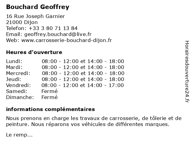 1 Brion Geoffrey Etienne Andre (Distance: 0,75 km) 3 Rue Corneille, 21000 Dijon andre, brion, etienne, geoffrey, restaurants 2 Maître Sophie Bouchard-Stech - Avocate (Distance: 1,52 km) 62 rue Chabot Charny, 21000 Dijon avocate, avocats, bouchard, civils, droits, juridiques, maître, sophie, stech 4 Guillaume Bouchard - Pédicure Podologue (Distance: 31,68 km) 23 Rue de Serrigny, 21550 Ladoix-Serrigny bouchard, guillaume, pieds, podologue, pédicure, soins 5 Bouchard Ainé Et Fils (Distance: 37,31 km) 4 Boulevard Maréchal Foch, 21200 Beaune ainé, bouchard, et, fils 6 Domaine Bouchard Père & Fils (Distance: 37,43 km) 15 Rue du Château, 21200 Beaune bouchard, domaine, fils, père |