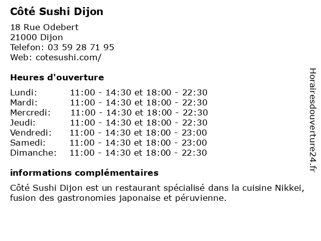 | Dimanche | 11:00-14:30 et 18:00-22:30 |