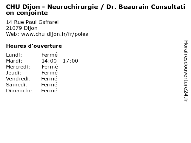 1 CHU Dijon - Neurochirurgie (Distance: 0,00 km) 14 Rue Paul Gaffarel, 21079 Dijon bureau, chu, consultation, dijon, dr, maladie, med, médecin, médecine, nantes, neurochirurgie, pratique, thérapie, traitement 2 CHU Dijon - Neurochirurgie / consultations (Distance: 0,00 km) 14 Rue Paul Gaffarel, 21079 Dijon bureau, chu, consultation, consultations, dijon, dr, maladie, med, médecin, médecine, nantes, neurochirurgie, pratique, thérapie, traitement 3 CHU Dijon - Neurochirurgie / visites (Distance: 0,00 km) 14 Rue Paul Gaffarel, 21079 Dijon bureau, chu, consultation, dijon, dr, maladie, med, médecin, médecine, nantes, neurochirurgie, pratique, thérapie, traitement, visites 4 CHU Dijon - Neurochirurgie / Pr. Mourier Consultation privée (Distance: 0,00 km) 14 Rue Paul Gaffarel, 21079 Dijon bureau, chu, consultation, dijon, dr, maladie, med, mourier, médecin, médecine, nantes, neurochirurgie, pr., pratique, privée, thérapie, traitement 5 CHU Dijon - Neurochirurgie / Pr. Mourier Consultation publique (Distance: 0,00 km) 14 Rue Paul Gaffarel, 21079 Dijon bureau, chu, consultation, dijon, dr, maladie, med, mourier, médecin, médecine, nantes, neurochirurgie, pr., pratique, publique, thérapie, traitement 6 CHU Dijon - Neurochirurgie / Dr. Beaurain Consultation publique (Distance: 0,00 km) 14 Rue Paul Gaffarel, 21079 Dijon beaurain, bureau, chu, consultation, dijon, dr, dr., maladie, med, médecin, médecine, nantes, neurochirurgie, pratique, publique, thérapie, traitement |