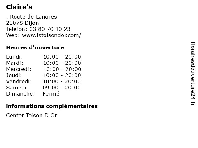 | 1 Claire's (Distance: 2,26 km) 15 Rue de la Liberté, 21000 Dijon beauté, bijoux, cheveux, claire's, jouets et objets de collection, mode, sacs, technologie 2 Claire's (Distance: 5,52 km) . Avenue de Bourgogne, 21800 Quetigny cafe, chaussures, claire's, enfants, homme, lingerie, mode femme, restaurant 3 Claire Fouchard - Sophrologue (Distance: 1,92 km) 12 Rue Tescelin le Roux, 21121 Fontaine-lès-Dijon claire, fouchard, medecin, sante, sophro, sophrologue 4 Maître Claire de Vogue - Avocate (Distance: 2,19 km) 14 bis rue de la Poste, 21000 Dijon avocate, avocats, civils, claire, de, droits, juridiques, maître, vogue 5 Maître Claire Lancelin - Avocate (Distance: 2,32 km) 4 rue du Docteur Maret, 21000 Dijon avocate, avocats, civils, claire, droits, juridiques, lancelin, maître 6 Dr Claire Gallon - Médecin généraliste - secrétariat (Distance: 4,79 km) 1 Rue de la Mare, 21380 Asnières-lès-Dijon claire, consultation, docteur, dr, gallon, généraliste, med, médecin, médecine, secrétariat, traitement |