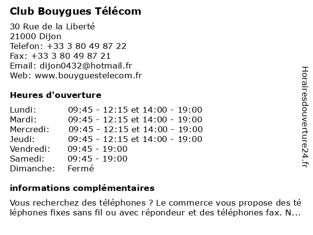 1 BOUYGUES TELECOM (Distance: 0,01 km) 30 Rue de la Liberté, 21000 Dijon bouygues, fai, fournisseur d'accès internet, telecom, téléphonie mobile 2 Freestyle Club (Distance: 0,97 km) 14 Rue Jean Baptiste Lallemand, 21000 Dijon business, center, club, fitness, freestyle, gym, health 3 Badminton Club (Distance: 1,73 km) 8 rue Olympe de Gouges, 21000 Dijon accessoires, badminton, club, dijonnais, magasins 4 Celio Club (Distance: 2,29 km) . Route de Langres, 21078 Dijon beaute, bijoux, celio, chaussures, club, enfants, maison, mode femme, mode homme, restaurant, service, sport 5 Liberty Gym (Acces club) (Distance: 3,02 km) 11 D Boulevard Rembrandt, 21000 Dijon acces, cardio, club, fitness, gym, liberty, musculation 6 BOUYGUES TELECOM (Distance: 4,02 km) Avenue de Langres, 21000 Dijon bouygues, fai, fournisseur d'accès internet, telecom, téléphonie mobile |