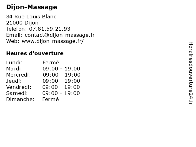 1 Sophie Bourgeois - Massage Bien-être (Distance: 0,61 km) 2 Avenue Raymond Poincaré, 21000 Dijon bien, bien-être, bourgeois, dijon, massage, sophie, être 2 Les Jardins du Massage (Distance: 0,81 km) 18 Rue Nicole-Reine Lepaute, 21000 Dijon du, jardins, les, massage, massages, relaxation, santé, thérapies 3 L' Atelier du Massage (Distance: 0,88 km) 78 Rue de la Préfecture, 21000 Dijon atelier, du, l', massage, massages, relaxation, santé, thérapies 4 Massage Détente (Distance: 0,90 km) 1 Rue Corneille, 21000 Dijon détente, massage, massages, relaxation, santé, thérapies 5 Ecole Francaise de Massage (Distance: 1,14 km) 23 Rue de Montchapet, 21000 Dijon de, ecole, francaise, massage, massages, relaxation, santé, thérapies 6 Institut de Formation Joël Savatofski (Distance: 0,59 km) 1 Rue Dr André Barbier, 21000 Dijon de, de bien-être, du toucher-massage, et au toucher-massage, formation, institut, joël, propose des stages et des formations certifiantes aux massages, savatofski, école européenne |