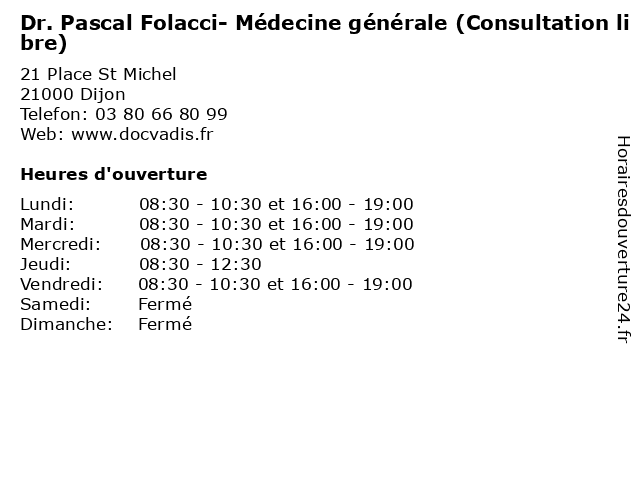 1 Cabinet médical du Dr Folacci Pascal - Médecine générale (secrétariat ) (Distance: 0,00 km) 21 Place St Michel, 21000 Dijon cabinet, consultation, docteur, dr, du, folacci, générale, médecine, médical, pascal, santé, secrétariat 2 Dr Marie-Christine Folacci-Genevois - Médecin généraliste (Distance: 0,09 km) 21 Place Saint-Michel, 21000 Dijon christine, docteur, dr, folacci, generaliste, genevois, généraliste, marie, medical, médecin, soin 3 Clinique des Champs Elysées Dijon - Médecine esthétique, épilation laser, Hydrafacial, injections, cryolipolyse & greffe (Distance: 0,41 km) 76 Rue de la Liberté, 21000 Dijon champs, clinique, cryolipolyse, des, dijon, elysées, esthétique, greffe, hydrafacial, injections, laser, médecine, épilation 4 Dr. Jean Claude Gaillagot - Ophtalmologie (Consultation sur rendez-vous) (Distance: 0,41 km) 12 rue Pelletier de Chambure, 21000 Dijon claude, consultation, docteur, dr., gaillagot, jean, ophtalmologie, rendez, santé, sur, vous 5 Maître Pascal Forzinetti - Avocat (Distance: 0,49 km) 15 Bis Boulevard Thiers, 21000 Dijon avocat, avocate, avocats, civils, droits, forzinetti, juridiques, maître, pascal 6 Centre Consultation Familiale (Distance: 0,62 km) 14 bis Rue du Chapeau Rouge, 21000 Dijon centre, consultation, familiale |