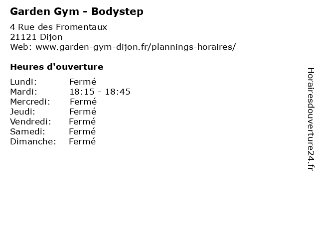 1 Garden Gym (Distance: 0,00 km) 4 Rue des Fromentaux, 21121 Ahuy business, center, fitness, garden, gym, health 2 Garden Gym - Les Silhouette (Distance: 0,00 km) 4 Rue des Fromentaux, 21121 Dijon centre, cours, garden, gym, l'exercice, la santé, le sport, les, les muscles, silhouette 3 Garden Gym - CxWorx (Distance: 0,00 km) 4 Rue des Fromentaux, 21121 Dijon centre, cours, cxworx, garden, gym, l'exercice, la santé, le sport, les muscles 4 Garden Gym - Stretching (Distance: 0,00 km) 4 Rue des Fromentaux, 21121 Dijon centre, cours, garden, gym, l'exercice, la santé, le sport, les muscles, stretching 5 Garden Gym - Fessiers (Distance: 0,00 km) 4 Rue des Fromentaux, 21121 Dijon centre, cours, fessiers, garden, gym, l'exercice, la santé, le sport, les muscles 6 Garden Gym - Pilates (Distance: 0,00 km) 4 Rue des Fromentaux, 21121 Dijon centre, cours, garden, gym, l'exercice, la santé, le sport, les muscles, pilates |