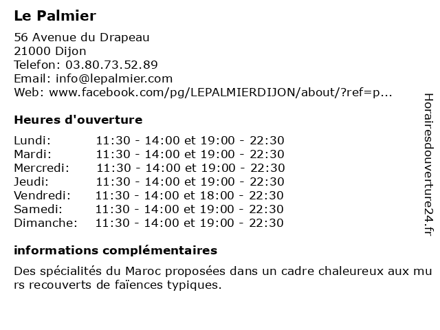 | Vendredi | 11:30-14:00 et 18:00-22:30 |