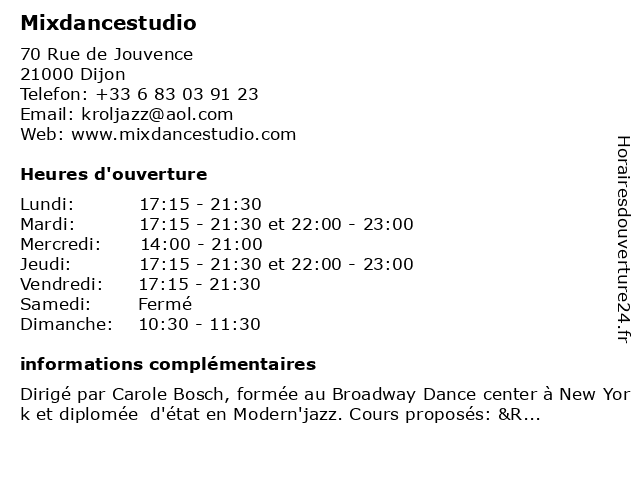 Dirigé par Carole Bosch, formée au Broadway Dance center à New York et diplomée d'état en Modern'jazz. Cours proposés: &Ragga & hip hop & contemporain & street jazz & modern'jazz . Enfants dès 4 ...