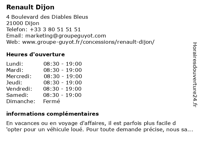 1 Renault Rent (Distance: 0,09 km) . Boulevard des Diables Bleus, 21000 Dijon automobile, concessionnaire, location, renault, rent 2 Garage Eiffel - Renault (Distance: 1,52 km) 60 avenue Gustave Eiffel, 21000 Dijon atelier, automobile, eiffel, entretien, garage, renault, reparation, vente 3 Garage de Amorim - Renault (Distance: 2,52 km) 21 Boulevard de l'Ouest, 21000 Dijon amorim, de, entretien, garage, neuves, occasion, renault, réparation, vente, voitures 4 Garage Dyn'Auto - Renault - Atelier (Distance: 2,60 km) 1 Rue Pierre Lauterbach, 21600 Longvic atelier, automobile, dyn'auto, entretien, garage, neuf, occasion, renault, réparation, vente, vidange 5 Maître Isabelle Renault-Le Hir - Avocate (Distance: 3,26 km) 6 rue Claus Sluter, 21000 Dijon avocate, avocats, civils, droits, hir, isabelle, juridiques, le, maître, renault 6 Renault - Toison d'Or Auto - Accueil (Distance: 5,97 km) 25 Rue des Grandes Varennes, 21121 Ahuy accueil, atelier, auto, automobile, concessionnaire, d'or, garage, neuf, occasion, renault, toison, vente |