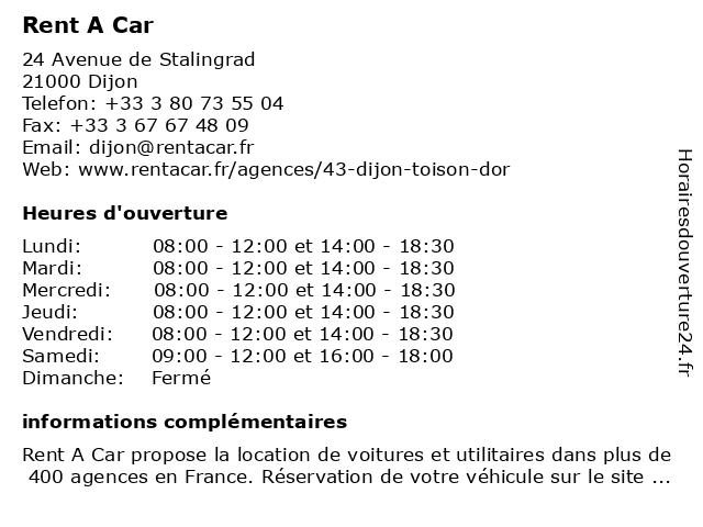 1 Rent A Car (Distance: 3,40 km) 11 Avenue Jean Jaurès, 21000 Dijon agence de location de véhicules, aller simple, car, location d'utilitaires, location de voitures, location de véhicules, rent, voiture sans permis 2 Budget Car Rental (Distance: 0,09 km) 24 Avenue De Stalingrad, 21000 Dijon budget, car, location de voiture, location de véhicules, rental 3 BH Car (Distance: 1,37 km) 2 rue de l' Escaut, 21850 Saint-Apollinaire auto, bh, buy, car, sales, services 4 Mairie du Dijon - Car Park (Distance: 1,99 km) . Rue Auguste Comte, 21000 Dijon car, dijon, du, mairie, park, parking, services 5 Mairie du Dijon - Car Park (Distance: 2,34 km) . Rue Bossuet, 21000 Dijon car, dijon, du, mairie, park, parking, services 6 Enterprise Rent-a-Car (Distance: 2,76 km) 29 Cours De La Gare, 21000 Dijon car, de voiture, enterprise, large gamme de véhicules, location de véhicule utilitaire, nos meilleurs, rent |