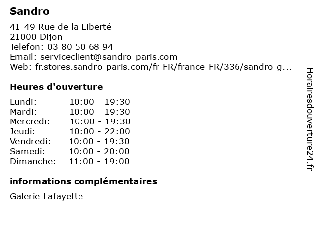 1 Sandro Homme (Distance: 0,01 km) 41-49 Rue de la Liberté, 21000 Dijon accessoires, chaussures, femme, homme, mode, sandro 2 Balibaris (Distance: 0,00 km) 41-49 rue de la Liberté, 21000 Dijon accessoires, balibaris, habillement, mode, vetement 3 Comptoir des Cotonniers (Distance: 0,00 km) 41/42 Rue de la Liberté, 21000 Dijon accessoires, chaussures, comptoir, cotonniers, des, mode femme 4 Catimini (Distance: 0,00 km) 41 rue de la Liberté, 21000 Dijon accessoires, catimini, enfants, filles, garçons, habillement, mode, pret à porter, vêtements 5 Maison 123 (Distance: 0,00 km) 41 Rue Liberté, 21000 Dijon 123, accessoires, chaussures, maison, maroquinerie, mode 6 Claudie Pierlot (Distance: 0,00 km) 41 Rue Liberté, 21000 Dijon accessoires, claudie, mode, pierlot, prêt-à-porter, vêtements |