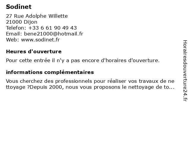 1 Sodinet (Distance: 0,30 km) 47 rue Jeanniot, 21000 Dijon de locaux, nettoyage de vitres, nettoyage industrielentretien des parties communes, société de nettoyage, sodinet |