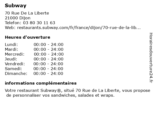 1 Subway (Distance: 0,72 km) 17 Avenue Foch, 21000 Dijon fast-food, restaurant à emporter, restaurants, subway 2 Subway (Distance: 4,72 km) 13 Rue Paul Langevin, 21300 Chenove fast-food, restaurant à emporter, restaurants, subway 3 PAUL (Distance: 0,12 km) 21/23 Rue de musette, 21000 Dijon boulangeries, boutique de desserts, café, paul, restaurant à emporter 4 Burger King (Distance: 0,24 km) 17 Rue De La Liberté, 21000 DIJON bar & gril, burger, king, restaurant américain, restaurant de hamburgers, restaurant familial, restaurant à emporter 5 LE RALLYE (Distance: 0,51 km) 6 rue audra, 21000 DIJON boissons à emporter, café, carterie, cbd, epicerie salée et sucrée, fdj, le, papéterie, presse, rallye, souvenirs, tabac, timbres, vape 6 Restaurant-Pizzeria Di Léo (Distance: 0,74 km) 13 Place de la République, 21000 Dijon di, italien, livraisons, léo, pizza, pizzas, pizzeria, restaurant, restauration, sur place, à emporter |