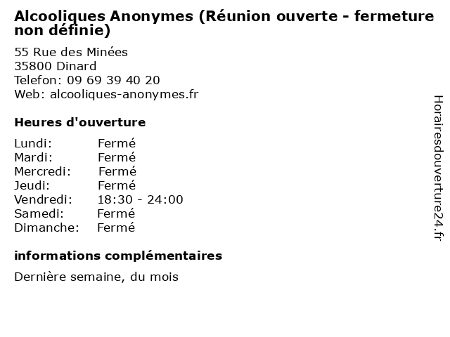 Termes de recherche pour Alcooliques Anonymes (Réunion ouverte - fermeture non définie):reunion, non, fermeture, ouverte, alcooliques, anonymes, définie |
