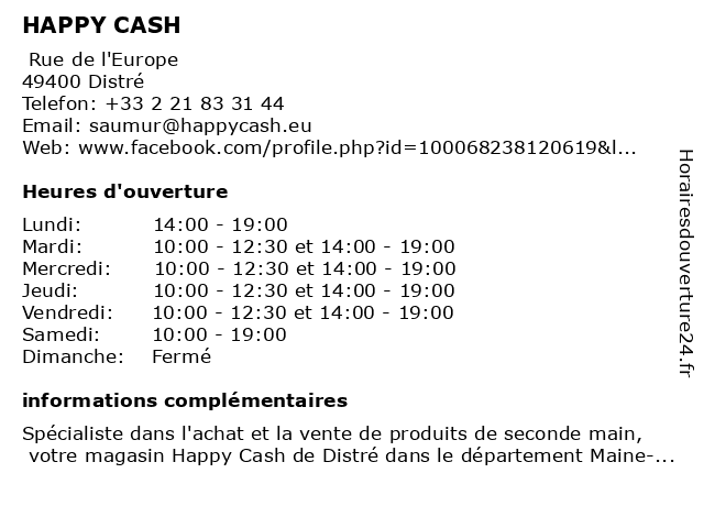 1 Cash Converters (Distance: 4,31 km) 21 Place De la Bilange, 49400 Saumur achats, cash, converters, des, multimédia, salle, électroménagerm 3 Happy Cash (Distance: 42,50 km) 30 rue Bodinier, 49100 Angers cash, happy, informatique, jeux, magasin, occasion, rachat, téléphone, vente 4 Happy Cash - Angers St Serge (Distance: 42,62 km) 3 Avenue Jean Joxé, 49100 Angers angers, cash, happy, informatique, jeux video, produits d'occasion, serge, st, téléphonie 5 Happy Lav (Distance: 42,93 km) 2 Rue Carmes, 49100 Angers automatique, happy, lav, lavage, service, séchage 6 Sushi Happy (Distance: 43,04 km) Carrefour Angers Saint Serge, 49100 Angers happy, restaurants, sushi |