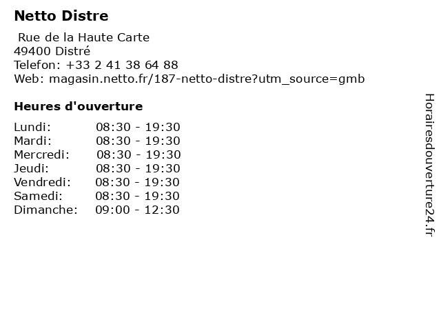 2 Distre Contrôle Technique Auto (Distance: 0,05 km) Route de Cholet, 49400 Distré auto, contrôle, distre, technique 3 Netto (Distance: 0,14 km) - champ Blauchard, 49400 Distré achats de produits alimentaires, des prix bas, grands supermarchés, hard discount, netto, supermarchés 4 Netto Saint Lambert Des Levées (Distance: 6,64 km) 129 Boulevard des Demoiselles, 49400 Saumur des, lambert, levées, netto, saint 5 Netto Longué-Jumelles (Distance: 16,07 km) Avenue de Saumur, 49160 Longué-Jumelles jumelles, longué, netto 6 Netto (Distance: 22,58 km) - Avenue Jean Causeret, 37140 Bourgueil achats de produits alimentaires, des prix bas, grands supermarchés, hard discount, netto, supermarchés |