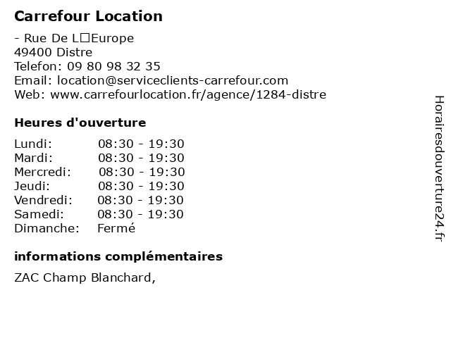 1 Carrefour Drive (Distance: 0,00 km) . Rue de l’Europe, 49400 Distre carrefour, drive, hypermarche, marche, market 2 Carrefour Station Service (Distance: 0,35 km) - Rue de l'Avenir, 49400 Distré carburant, carrefour, essences, gazole, service, services, station 3 Ford - Clenet Saumur - Location (Distance: 3,15 km) - Rue de Doué, 49400 Saumur clenet, ford, location, révisions, saumur, service, services, services d'automobiles 4 Carrefour Contact (Distance: 3,58 km) - Place du Poisson Rouge, 49400 Saumur alimentation, carrefour, contact, magasin discount, market, supermarché 5 Foncia Location (Distance: 4,14 km) 6 place Dupetit Thouars, 49400 Saumur copropriété, foncia, gestion locative, l'achat, la vente et la location, location 6 Carrefour City (Distance: 4,41 km) 17 Rue Saint-Nicolas, 49400 Saumur alimentation, carrefour, city, magasin discount, market, supermarché |