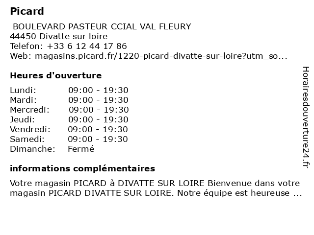 Votre magasin PICARD à DIVATTE SUR LOIRE Bienvenue dans votre magasin PICARD DIVATTE SUR LOIRE. Notre équipe est heureuse de vous accueillir et pourra vous conseiller avec professionnalisme et en...