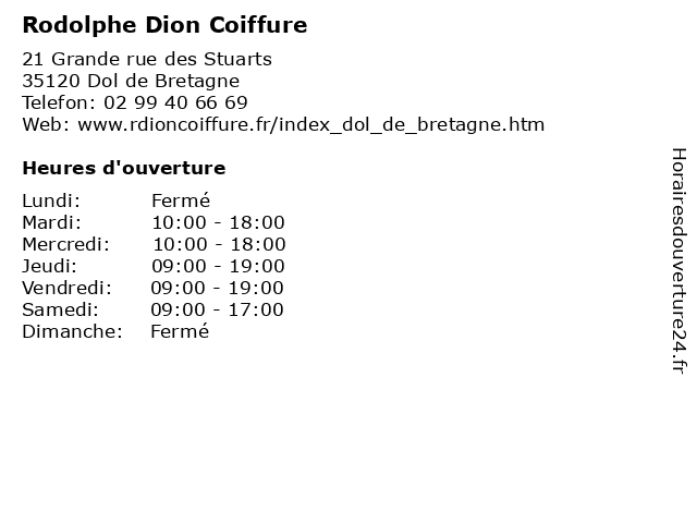 | 1 Rodolphe Dion Coiffure (Distance: 19,72 km) 7 Place du Manoir, 35400 Saint-Malo coiffeur, coiffure, dion, mixte, rodolphe 2 Excell Coiffure (Distance: 0,25 km) 39 rue Lejamptel, 35120 Dol de Bretagne coiffeur, coiffure, excell, mixte 3 Carme Coiffure (Distance: 0,33 km) 3 rue des Carmes, 35120 Dol de Bretagne carme, coiffeur, coiffure, mixte, salon de coiffure, visagiste 4 Hélène Coiffure (Distance: 7,26 km) 24 rue du Général de Gaulle, 35540 Plerguer coiffeur, coiffure, hélène, mixte 5 Hurgane Coiffure (Distance: 8,04 km) 14 Place de l'Église, 35120 La Boussac coiffeur, coiffure, hurgane, mixte 6 Excell Coiffure (Distance: 14,61 km) n/a Rue des Coutures, 35270 Combourg coiffeur, coiffure, excell, ille-et-vilaine |