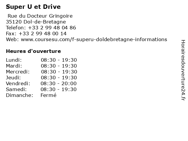 2 Super U Location (Distance: 0,35 km) - rue de Docteur Gringoire, 35120 Dol-de-Bretagne location, super, transport, utilitaire, véhicule 3 Carrefour Drive (Distance: 1,27 km) 2 Rue De La Rouelle,, 35120 Dol De Bretagne carrefour, drive, hypermarche, marche, market 4 Carrefour Drive (Distance: 12,14 km) 17 Rue De La Liberation, 35540 Miniac-Morvan alimentaire, carrefour, courses, drive, en ligne, magasin 5 Intermarché SUPER Combourg (Distance: 14,39 km) 14 Rue des coutures, 35270 Combourg combourg, intermarché, super 6 Intermarché SUPER Pleine Fougeres (Distance: 14,95 km) Rue de ville Chérel, 35610 Pleine-Fougères fougeres, intermarché, pleine, super |