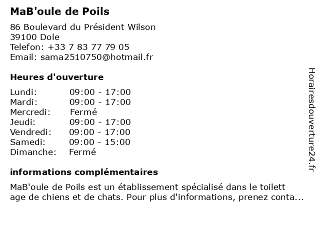 2 La Boule de Poils (Distance: 42,73 km) 27 avenue de Montrapon, 25000 Besançon accessoire, boule, chat, chien, de, la, poils, salon, toilettage, toiletteur 3 AU COSY POILS (Distance: 50,25 km) 7 Bis Route de Voray, 70190 Boult au, baume les dames, besancon, boult, bucey les gy, cosy, dampierre sur salon, gray, les auxons, marnay, montboillon, pesmes, poils, rioz, thise, toiletteur, toiletteur chat, toiletteur chien, toiletteur tarif, vesoul 4 Pension Chien & Chat Boule de Poils à 4 Pattes (Distance: 57,55 km) 72 route de Colombey, 71370 Ouroux-Sur-Saône boule, chat, chenil, chien, de, garderie, pattes, pension, poils |
