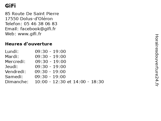 1 GiFi Loc (Distance: 5,39 km) 85 Route de Saint Pierre, 17550 Dolus D’Oleron agence, gifi, loc, location, services, utilitaires, véhicules 2 GiFi Loc (Distance: 26,64 km) - ZAC Des Fourneaux, 17690 Angoulins sur Mer agence, gifi, loc, location, utilitaires, véhicules 3 GiFi (Distance: 27,08 km) - Avenue des Fourneaux, 17690 Angoulins-sur-Mer ameublement, decoration, electromenager, gifi, maison 4 GiFi (Distance: 27,16 km) 8 Rue Villeneuve Montigny, 17300 Rochefort cadeaux, décoration, gifi, loisirs, magasin, maison 5 GiFi Loc (Distance: 27,29 km) - Lieu dit Petite Grange, 17300 Rochefort gifi, loc, location, trajets, voitures, voyage 6 GiFi Loc (Distance: 32,68 km) 4 Rue de Belgique, 17138 Puilboreau gifi, loc, location, trajets, voitures, voyage |