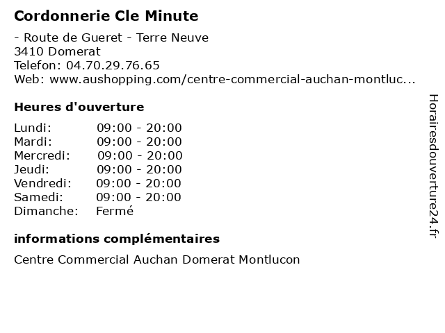 1 Cordonnerie Cles Minute (Distance: 0,29 km) . Terre neuve, 03410 Domerat beaute, boutiques, chaussures, cles, cordonnerie, deco, enfants, minute, mode femme, mode hommes, restaurant, sport 2 Renault Minute - DIAM (Distance: 2,53 km) 24 rue Camille Desmoulins, 03100 Montluçon atelier, automobile, concessionnaire, diam, garage, minute, neuve, occasion, rapide, renault, réparation, service, vente 3 Welcom | Téléphone, reconditionné, réparation, forfait, box internet (Distance: 0,03 km) 65 Avenue des Martyrs, 03410 Domérat accessoires, bouygues telecom, box, box internet, box internet fibre, coriolis télécom, diagnostic téléphone, forfait, forfait mobile, internet, objets connectés, occasion, reconditionné, reconditionnés, reprise de téléphone, reprise iphone, revendez votre téléphone actuel, réparation, réparation téléphone, téléphone, téléphones neufs, téléphonie mobile, vendre son ancien téléphone, welcom, éligibilité à la fibre 4 Welcom | Téléphone, reconditionné, réparation, forfait, box internet (Distance: 2,79 km) 52 Boulevard de Courtais, 03100 Montluçon accessoires, bouygues telecom, box, box internet, box internet fibre, coriolis télécom, diagnostic téléphone, forfait, forfait mobile, internet, objets connectés, occasion, reconditionné, reconditionnés, reprise de téléphone, reprise iphone, revendez votre téléphone actuel, réparation, réparation téléphone, téléphone, téléphones neufs, téléphonie mobile, vendre son ancien téléphone, welcom, éligibilité à la fibre 5 Brico Pro (Distance: 28,82 km) 167 rue jean jaurès, 63700 Saint-Éloy-les-Mines atelier, brico, carte de fidelite, cles minute, conseil, contrat de maintenance, decoupe, financement, pro, sav 6 Brico Pro (Distance: 29,93 km) 13 avenue du berry, 23230 Gouzon atelier, brico, carte de fidelite, cles minute, conseil, contrat de maintenance, decoupe, financement, pro, sav |