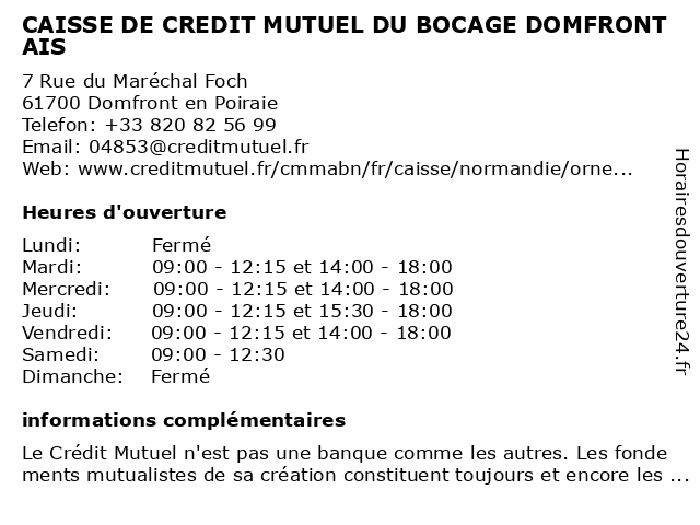 1 Crédit Mutuel (Distance: 0,01 km) 7 Rue Du Marechal Foch, 61700 Domfront En Poiraie compagnie de téléphone, crédit, mutuel, organisme d'assurance 2 Crédit Mutuel (Distance: 7,71 km) 5 Rue Saint Michel, 61700 Lonlay L Abbaye compagnie de téléphone, crédit, mutuel, organisme d'assurance 3 CAISSE DE CREDIT MUTUEL DU BOCAGE DOMFRONTAIS - LONLAY L ABBAYE (Distance: 7,71 km) 5 Rue Saint-Michel, 61700 Lonlay-l'Abbaye abbaye, bocage, caisse, credit, de, domfrontais, du, lonlay, mutuel 4 CAISSE DE CREDIT MUTUEL DU BOCAGE DOMFRONTAIS - PASSAIS MANTILLY (Distance: 11,02 km) 198 Rue du Domfrontais, 61350 Passais Villages bocage, caisse, credit, de, domfrontais, du, mantilly, mutuel, passais 5 Crédit Mutuel (Distance: 11,43 km) 198 Rue Du Domfrontais, 61350 Passais Villages compagnie de téléphone, crédit, mutuel, organisme d'assurance 6 Crédit Mutuel (Distance: 13,85 km) . Rue de Monteglise, 50720 Barenton assurances, bancaire, banque, crédit, mutuel, services |