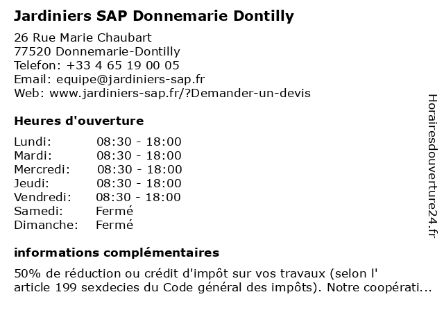 1 Jardiniers SAP Donnemarie Dontilly (Distance: 0,00 km) 26 Rue Marie Chaubart, 77520 Donnemarie-Dontilly donnemarie, dontilly, jardiniers, sap 4 Jardiniers SAP Fontainebleau (Distance: 32,68 km) 67 Rue du Château, 77300 Fontainebleau fontainebleau, jardiniers, sap 6 |