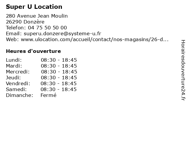 2 Super U Station Service (Distance: 0,08 km) 280 Avenue Jean Moulin, 26290 Donzere essences, oil, service, services, station, stations essences, super 3 Intermarché SUPER Donzère (Distance: 2,66 km) Avenue des Éoliennes, 26290 Donzère donzère, intermarché, super 4 Van-Away Drôme Ardèche - Location de vans aménagés (Distance: 3,10 km) 155 Chemin de la Berre, 26700 Pierrelatte aménagés, ardèche, away, campervan, camping-car, canoë, chateaux, de, drôme, gorges de l'ardèche, gorges du verdon, grignan, grotte chauvet, lavandes, location, location van aménagé, nougat, olives de nyons, provence, vacances, van, van california, vans, vercors 5 Intermarché SUPER Donzère (Distance: 3,40 km) Zone artisanale des éoliennes, za des eoliennes, 26290 Donzère donzère, intermarché, super 6 Axe Location (Distance: 5,09 km) 80 impasse Nicolas Appert, 26780 Malataverne axe, bâtiment, location, matériel, publics, travaux, vente  |