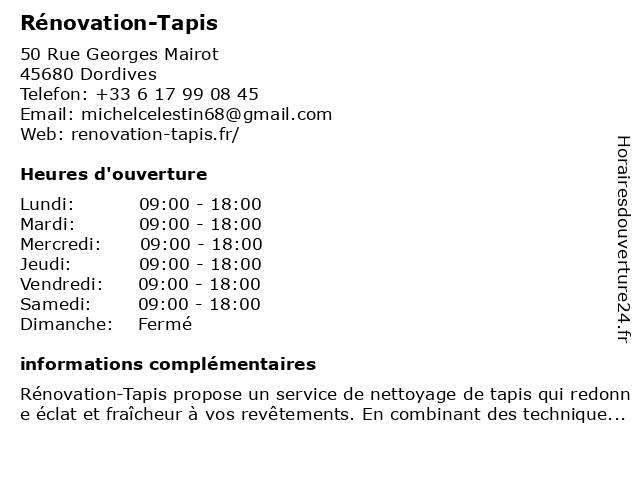 1 Perboni Tapis (Distance: 0,18 km) 1 Avenue des Aulnoys, 45680 Dordives conservations, perboni, restaurations, tapis, tapisseries 3 Terre Éco-Logis Rénovation Energétique Globale (Distance: 14,10 km) 95 Rue du Beauregard, 77140 Nemours energétique, globale, logis, rénovation, terre, éco 4 Plombier Repare.com Travaux plomberie salle de bain douche senior chauffage rénovation Assurance DEPANNAGE (77,45,89,91) (Distance: 15,34 km) 6 Rue Du Prieuré, 77140 Nemours 45, 77, 89, 91, aménagement intérieur, assurance, bain, chauffage, chauffagiste, de, depannage, douche, entrepreneur en alimentation en gaz, magasin de matériel de plomberie, plomberie, plombier, repare.com, rénovation, salle, senior, travaux 5 AS Rénovation & Costiles Carrelages (Distance: 16,16 km) 91 Rue de la Libération, 45200 Montargis as, carrelages, costiles, rénovation 6 |