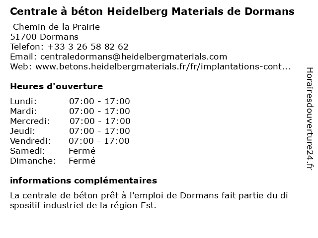 1 Pharmacie Centrale (Distance: 0,27 km) 21 rue Jean de Dormans, 51700 Dormans centrale, homéopathie, médicaments, orthopédie, parapharmacie, pharmacie 2 Pharmacie Centrale (Distance: 17,83 km) 46 Grande Rue, 02400 Château-Thierry centrale, conseils, médicaments, orthopédie, parapharmacie, pharmacie 3 Centrale à béton Heidelberg Materials d'Epernay (Distance: 21,74 km) 15 Rue du Pré Bréda, 51530 Mardeuil béton, centrale, d'epernay, heidelberg, materials 4 Plateforme Heidelberg Materials d'Epernay (Distance: 23,49 km) 35 Quai de Marne, 51200 Épernay d'epernay, heidelberg, materials, plateforme 5 Centrale à béton Heidelberg Materials de Reims (Distance: 33,50 km) Avenue Brébant, 51100 Reims béton, centrale, de, heidelberg, materials, reims 6 Carrière de granulats Heidelberg Materials de Vasseny (Distance: 33,91 km) Rue de Quincampoix, 02220 Ciry-Salsogne carrière, de, granulats, heidelberg, materials, vasseny |