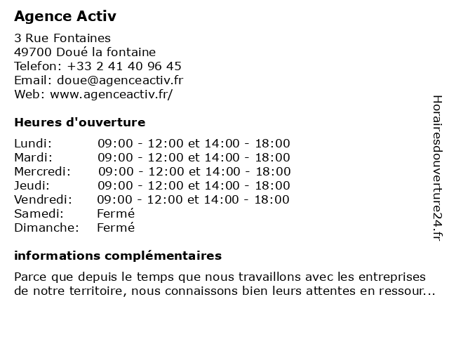 1 SARL ACTIV SOLUTIONS RH (Distance: 0,39 km) 1 b Avenue Du General Leclerc, 49700 DOUE EN ANJOU activ, rh, sarl, solutions 2 Activ'Expertise Angers Ouest (Distance: 48,08 km) 15 Rue des Loriots, 49125 Tierce activ'expertise, angers, ouest 3 Activ Réno (Distance: 51,73 km) 206 Avenue des 3 Provinces, 49300 Cholet activ, chauffage, dépannage, electricité générale, isolation, menuiserie, réno 4 |