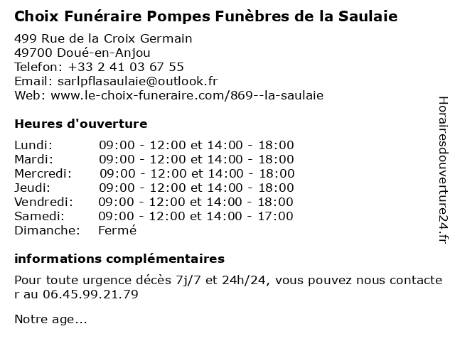 1 Bistrot de la Saulaie (Distance: 1,08 km) 104 rue des Fougerons, 49700 Doué-la-Fontaine bistrot, de, hebergement, hotel, la, restauration, saulaie 2 The Originals City, Hôtel La Saulaie, Saumur Ouest (Inter-Hotel) (Distance: 1,09 km) 104 Rue des Fougerons, 49700 Doué-en-Anjou châteaux, city, hotel, hôtel, inter, la, oenotourisme, originals, ouest, randonnée, roseraie, saulaie, saumur, the, tourisme, trekking, troglodyte, vélo 3 Pépinières de la Saulaie (Distance: 2,18 km) n/c Route d'Angers, 49700 Doué la fontaine de, jardinerie, la, plantes, pépinière, pépinières, saulaie, végétaux 4 Bidet Pompes Funèbres Privées (Distance: 2,47 km) Rue Haute Saint-Denis, 49700 Doué-en-Anjou bidet, funèbres, pompes, privées 5 Pompes funèbres PFG SAUMUR (Distance: 14,00 km) 317 Rue Robert Amy, 49400 Saumur avis de décès, crémation, entretien de sépulture, fleurs deuil, formalités après obsèques, funèbres, inhumation, marbrerie, monument funéraire, pfg, pompes, pompes funèbres, prévoyance obsèques, saumur 6 Pompes Funèbres Roger Père & Fils (Distance: 14,36 km) 6 Rue des Grands Clos, 49260 Bellevigne-les-Châteaux articles funéraires, contrats obsèques, devis gratuit, fils, funèbres, organisation d'obsèques, pompes, père, rapatriement, roger, travaux de marbrerie |
