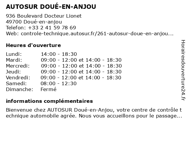 1 Autosur - Arènes Contrôle Technique (Distance: 3,57 km) . Zone Artisanale de la Saulaie, 49700 Doué-En-Anjou arènes, automobile, autosur, camion, centre, controle, contrôle, lourd, poids, technique 3 6 AUTOSUR SAINT-GEORGES-SUR-LOIRE (Distance: 42,49 km) D961, 49170 Saint-Georges-sur-Loire autosur, georges, loire, saint, sur |