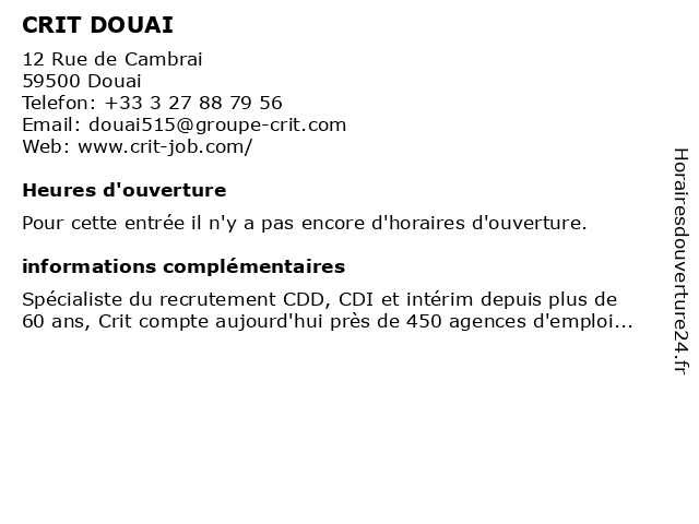 2 Crit Job - Automobile (Distance: 0,73 km) 125 rue de Valenciennes, 59500 Douai agence, automobile, crit, emplois, intérim, job, offres 4 CRIT HENIN BEAUMONT (Distance: 11,05 km) 27 Avenue Victor Hugo, 62110 Hénin-Beaumont beaumont, crit, henin 6 |
