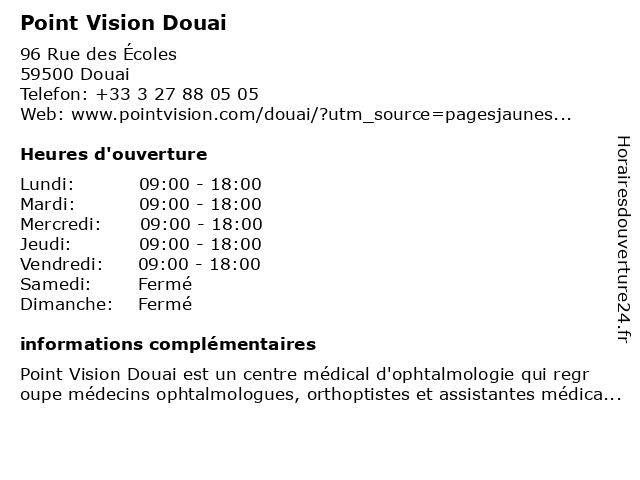 Point Vision Douai est un centre médical d'ophtalmologie qui regroupe médecins ophtalmologues, orthoptistes et assistantes médicales, pour la prise en charge de votre santé visuelle. Nous vous ...