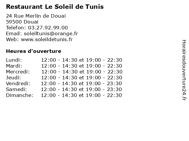 | Dimanche | 12:00-14:30 et 19:00-22:30 |