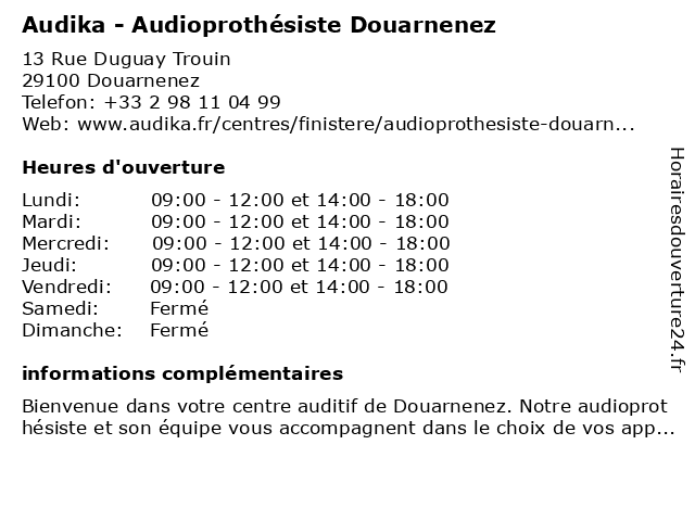 1 Auditiv Solutions - Audioprothésiste Douarnenez (Distance: 0,00 km) 13 Rue Duguay Trouin, 29100 Douarnenez audioprothésiste, auditiv, douarnenez, solutions 2 Audilab / Audioprothésiste Douarnenez (Distance: 0,08 km) 9 Rue Duguay Trouin, 29100 Douarnenez audilab, audioprothésiste, douarnenez 3 Audioprothésiste DOUARNENEZ Optical Center (Distance: 1,31 km) 7 Rue Edouard Branly, 29100 Douarnenez audioprothésiste, center, douarnenez, optical 4 Audioprothésiste Quimper-Alain Afflelou Acousticien (Distance: 19,66 km) 47 Rue Saint Mathieu, 29000 Quimper acousticien, afflelou, alain, audiologie, audioprothésiste, clinique médicale, quimper 5 Audioprothésiste Quimper Ronarc'h Audition Santé (Distance: 19,74 km) 28 Rue Amiral Ronarc'h, 29000 Quimper audiologie, audioprothésiste, audition, quimper, ronarc'h, santé 6 Audika - Audioprothésiste Quimper (Distance: 19,81 km) 52 Quai de l'Odet, 29000 Quimper appareil auditif, audika, audiologiste, audioprothésiste, centre auditif, quimper, spécialiste audition |