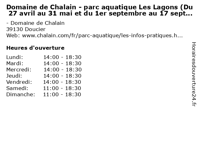 1 Domaine de Chalain - parc aquatique Les Lagons (Du 7 juillet au 31 aout) (Distance: 0,00 km) - Domaine de Chalain, 39130 Doucier 31, aout, aquatique, au, camping, chalain, de, domaine, du, hebergement, juillet, lagons, les, parc, tourisme 2 Domaine de Chalain - parc aquatique Les Lagons (Du 1er juin au 6 juillet) (Distance: 0,00 km) - Domaine de Chalain, 39130 Doucier 1er, aquatique, au, camping, chalain, de, domaine, du, hebergement, juillet, juin, lagons, les, parc, tourisme 3 Camping Domaine de Chalain (Distance: 0,00 km) - Domaine de Chalain, 39130 Doucier camping, caravaning, chalain, de, domaine, mobil home, séjour, tourisme, vacances 4 Camping Tohapi - Domaine de Chalain (Distance: 0,18 km) - Domaine de Chalain, 39130 Doucier camping, chalain, de, domaine, hebergement, tohapi, tourisme 5 Centre Equestre de Chalain (Distance: 3,25 km) 375 rue des 3 Lacs, 39130 Doucier centre, chalain, cheval, de, equestre, stages 6 Les Tritons - aquatique, bien-être (Du 1er juillet au 3 sept.) (Distance: 11,38 km) 25 Rue Léon Blum, 39300 Champagnole 1er, aqua, aquatique, au, bien, du, juillet, les, piscine, sept., tritons, être |